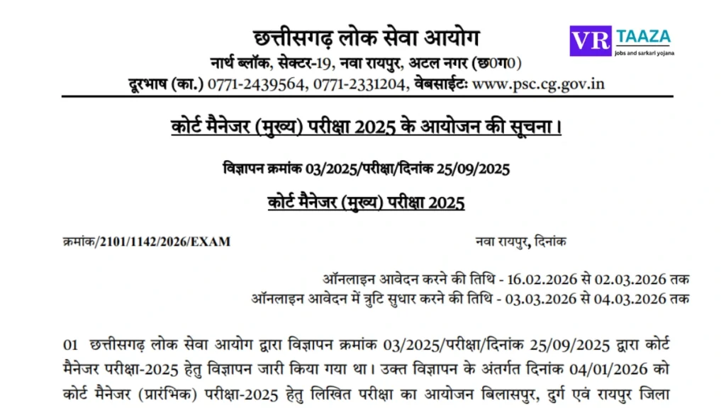 छत्तीसगढ़ लोक सेवा आयोग (CGPSC) ने कोर्ट मैनेजर भर्ती 2026 का नोटिफिकेशन जारी किया है। इच्छुक और योग्य उम्मीदवार इस