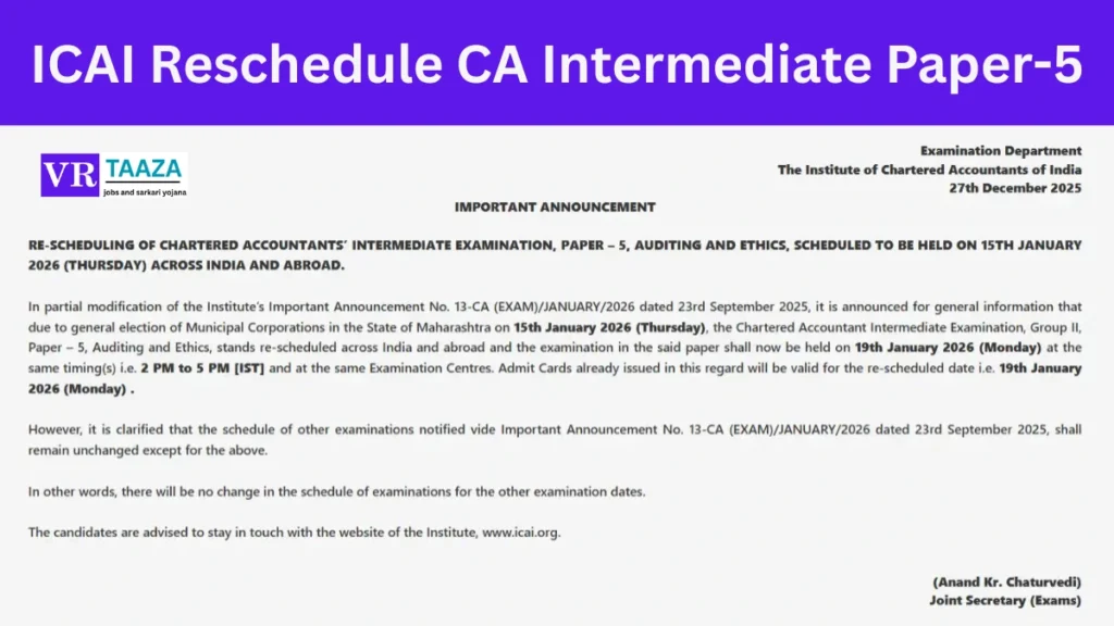 आईसीएआई सीए इंटरमीडिएट परीक्षा जनवरी 2026 – जानें नई डेट | पेपर 5 की तारीख बदली, जानें कारण | ICAI Reschedules CA Intermediate Paper-5